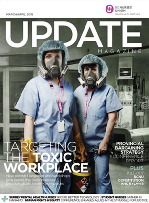 Read our feature story on the tools that nurses now have to help tackle the problem of toxic workplace cultures. Learn how Surrey mental health nurses used the professional responsibility process to secure better technology. You’ll also find a report from the union’s provincial bargaining strategy conferences.
