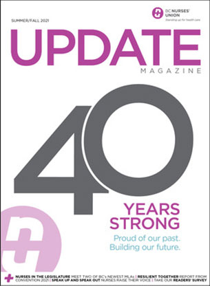 In this issue: BCNU marks its 40th year with a retrospective account of nurses’ fight for safe patient care and fair working conditions. New education initiatives support members’ psychological health. Members gather to speak up and speak out at BCNU’s first virtual convention. An interview with two of BC’s newest MLAs and proud BCNU members.
